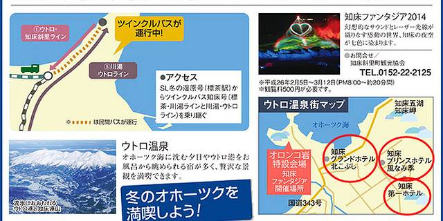 看点:通过镭射光线和音响演变了一个极光幻想空间。只要体验了这种感觉,肯定会成为冬季知床迷。UTORO温泉特设会场举行"印章收集","自然风景照竞赛"等活动,另外还有许多北国的游戏。