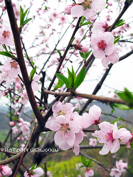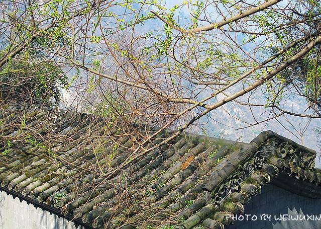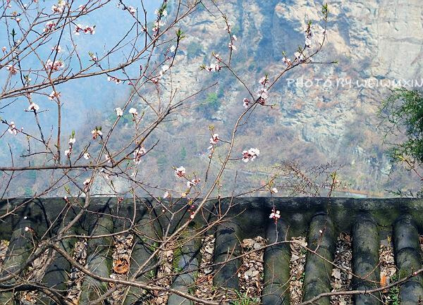 我拍了许多花。比如这几枝桃花,开在去往黄龙洞的途中。衬着青瓦白墙,格外美丽。