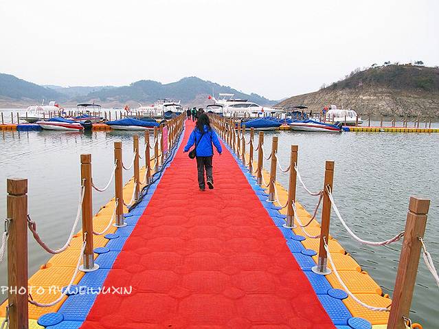 红黄蓝三色的浮桥。我戏称它为“红地毯”。