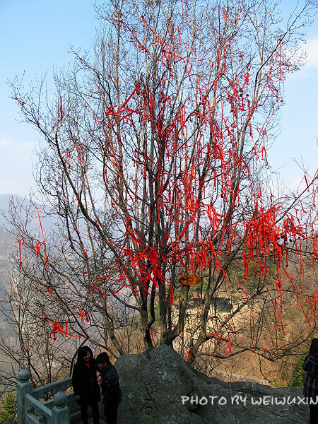 石头之后有棵大树,树杈上面挂满了红色布条——在武当山,你可以在林木之间无数次看到这些红色布条。