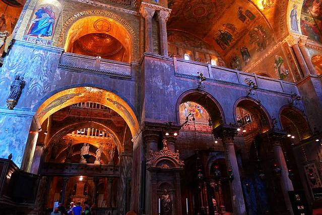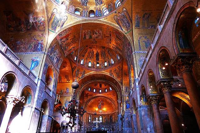 这是最著名的圣马可教堂(Basilica San Marco),圣马可是耶稣的使徒,是《马可福音》的作者。828年威尼斯商人,将圣马可的尸体从埃及亚历山大运回威尼斯。公元829年为此修建了这个教堂,当初只是总督府当中一座临时性的建筑。教堂采用拜占庭建筑风格,融合了东西方建筑的精华。