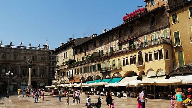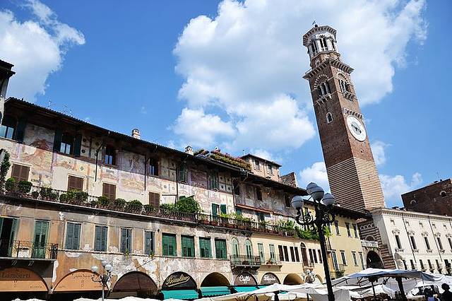 Erbe广场是维罗纳的市中心。广场周围集中了多数该城最漂亮的建筑,比如马菲宫,左侧是Gardello塔。