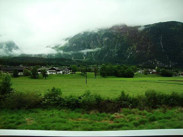早上7点出发的时候,雨还下得正欢,走到楼下才发现竟忘了拿伞,想想也只有家里跑到车站那点点路,忍一下也罢了。要是那边真的下雨,那我也无话可说了。火车也很正常地行驶,快到德奥边界的时候,已经可以看见阿尔卑斯山余脉了,云雾缭绕,峰顶若隐若现,就喜欢这样飘渺的感觉,只是欣赏之外,一个小时连绵不绝的雨水让我分外担心。