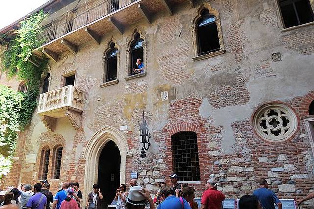 罗密欧曾在茱丽叶家的阳台向朱丽叶求爱,这段悲剧爱情故事和朱丽叶的阳台一起留给了后世。虽然这部戏剧的最早版本发生在锡耶纳而不是维罗纳,实际上也并不存在“朱丽叶的阳台”,维罗纳人不得不一次又一次地向慕名而来的游客解释这一遗憾的事实,但他们出于旅游业的目的还是在故居后院中按照莎士比亚的巨作建造起一座象征性阳台,以供游客朝拜这座“爱的圣地。