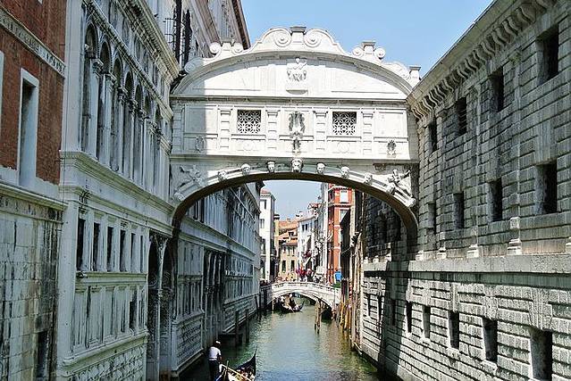 连接威尼斯公爵府的审讯室和老监狱的桥,封闭得很严实。相传每个犯人被押送到这里都要叹息一声,所以叫做叹息桥。