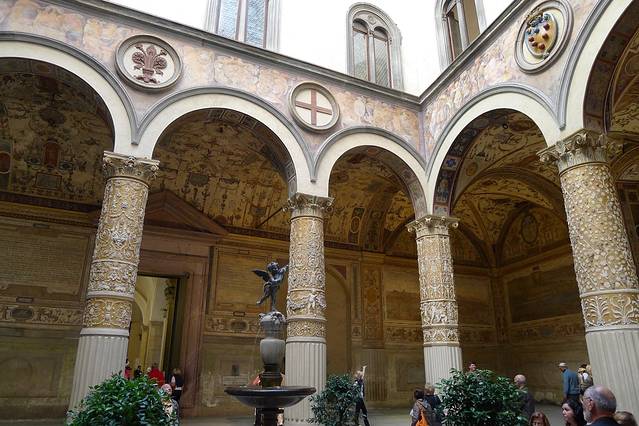 韦奇奥宫右侧的兰琪敞廊是集中展出雕塑的地方,其内雕塑大都是对神话传说或历史场景的再现。宫殿内部金碧辉煌。