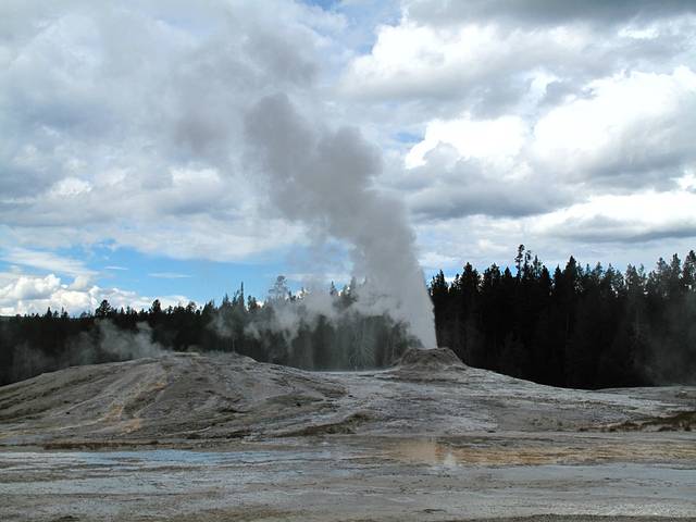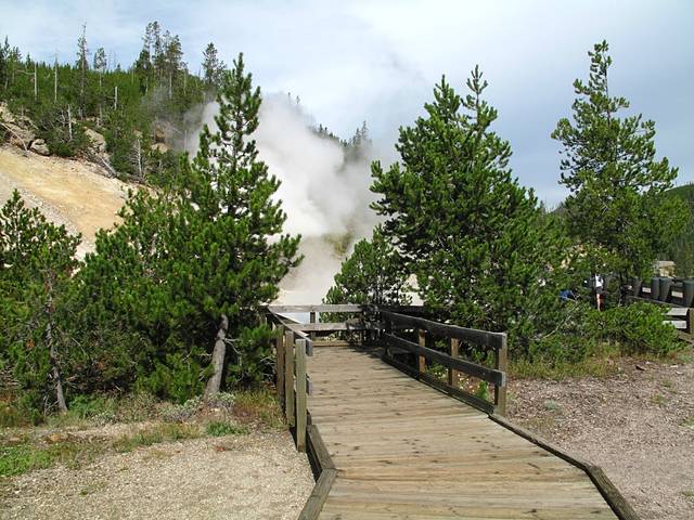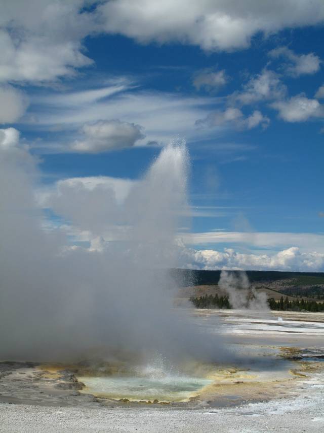 caption: 这个热泉很有意思,左右有一个小引泉,通常是左边的小泉开始喷发一段时间后,右边的大泉便开始喷发。我们路过的时候刚好碰上引泉喷发,有工作人员站在旁边,我们便上去问了问,据介绍,这个泉是不定期喷的,引泉开始活动后也不能预计大泉多久开始喷,我们赶着去看old faith,便没多等。。。。