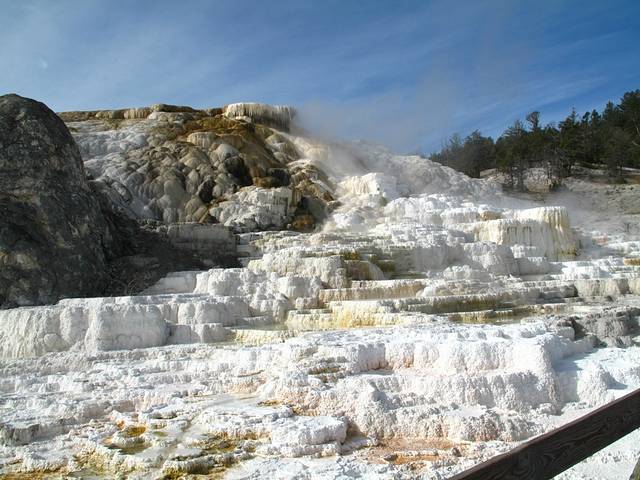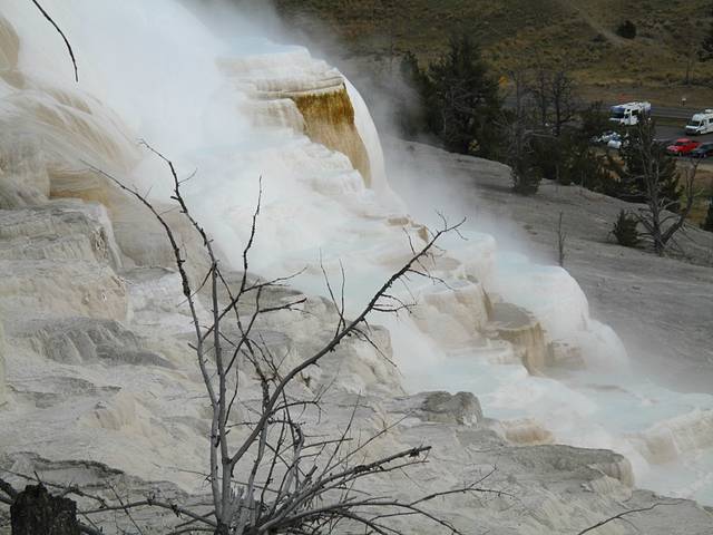无水冒烟版的黄龙 mammoth hot spring,其实有部分地方还是有水,形成一些小小的热泉小瀑布,但水量确实不多,但也不排除有一天它们有满水复活了。。。呵呵