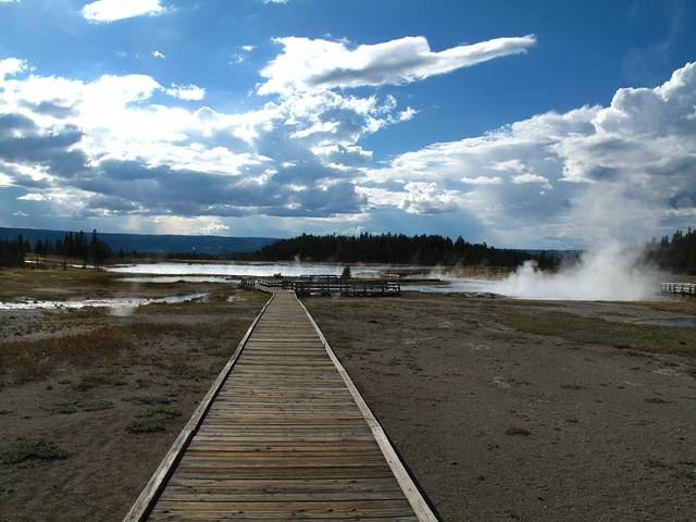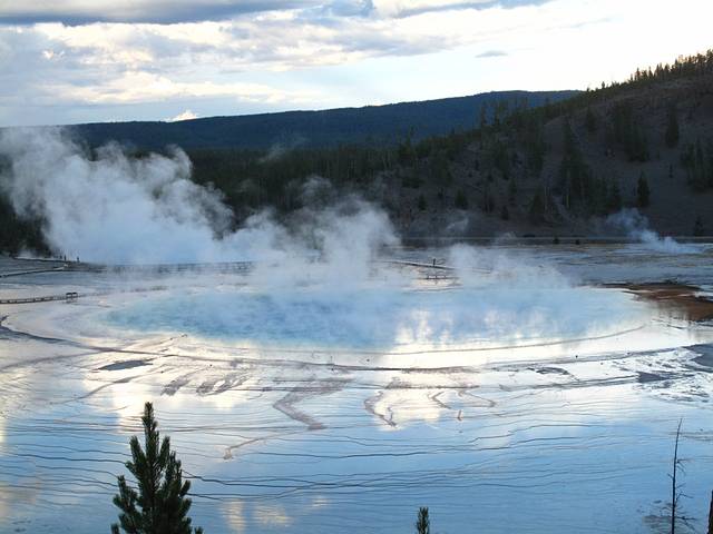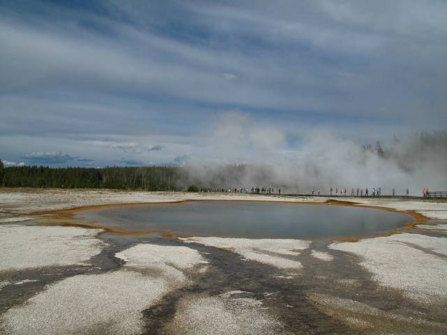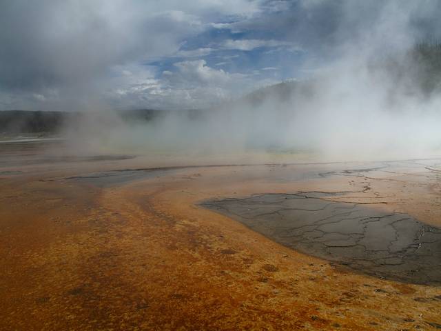 黄石最后一站,大棱镜,是园区最大的热泉池子,能见度高的时候可以看到五彩的颜色,只是那天池子雾气太大,远远的只看到一片热气,走近了也不过看到池边的硫磺。