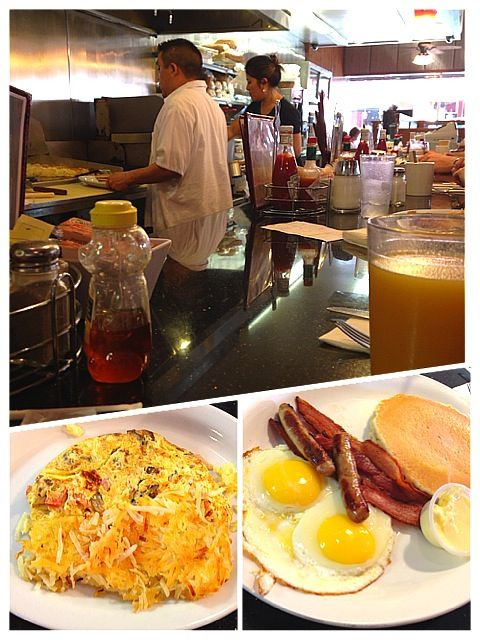 我们住在联合广场附近,早上睡了个懒觉起来,到对面24小时早餐店吃了美味的美式早餐fired eggs 和omelette,分量十足,面对着厨房一边看着厨师现做一边吃,连旁边的洗碗工洗碗都能看到。正吃着呢,收到老朋友的信息推荐“Union Square附近有间咖啡店叫Blue Bottle Coffee。在美国咖啡届很有名。他们的咖啡是蒸馏出来的。早餐/午餐也不错。不过不便宜。有兴趣可以去试试。” 当时我已经吃饱喝足了,没去,留给大家去试试吧。