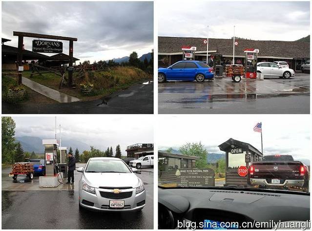 Jackson小镇距离大提顿不过十几公里,清早出发刚刚下过雨,阴天,天气微微凉,但空气清新,人呢神清气爽,嘟嘟嘟的开着小车子前往大提顿,路上找了个加油站,土鳖第一次自助加油,插了两次卡没反应,我就放弃研究,到处溜达乱拍去了,陆先生则跟旁边的帅哥hi buddy去了。两男人研究了一会,陆先森就招手喊我上车走了,所以加油的详情你们问他去吧。不过总的说来,除了拉斯维加斯要预交费用,你要自己先估计加多少油,然后去一部机子交了钱,并且选择自己车子停靠的加油机,比较麻烦以外,其他地方基本是插卡,加到满自动停,然后取卡即可。