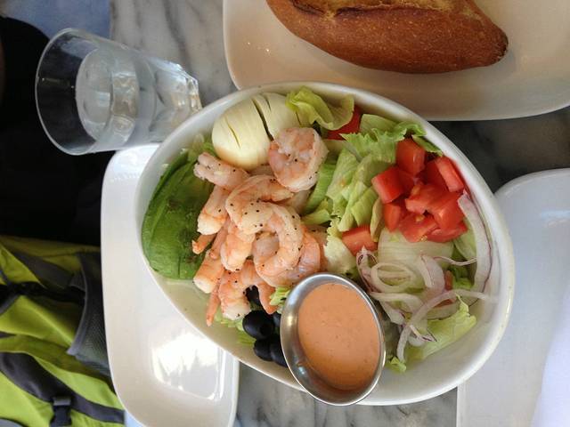 caption: 沙拉的分量也很大,里面的虾也很鲜美。太好吃了!