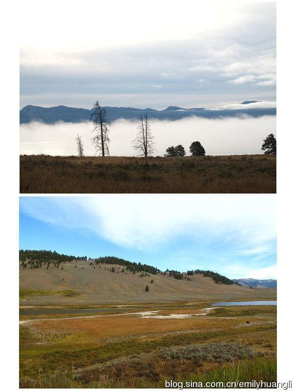 这一天,我们第一站是要去8字左上角的mammoth hot spring。黄石上八字除了mammoth,基本没有其他著名的景点了,风景虽也不错,但也算不上独特。过了canyon,逐渐开始爬山,地势渐渐高起来,把雾气抛在了身后,回望下8字,远远的看到零落的hot spring冒着烟,感觉是上帝在地球上戳了一些窟窿,颇有2012的感觉。