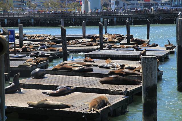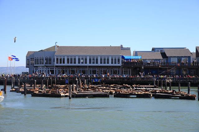 caption: 39号码头旁边好多海狮晒肚皮,一只两只看着挺可爱,一堆看着就密度恐惧啦!