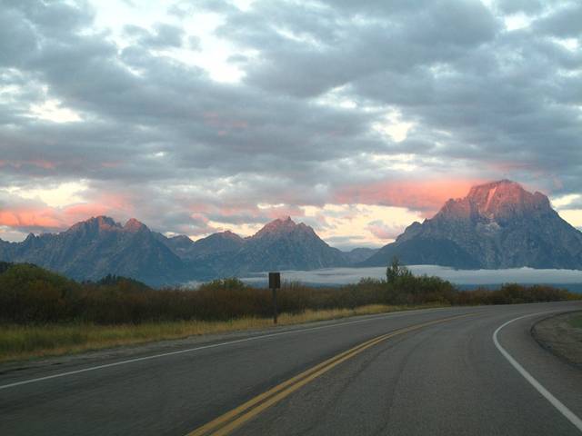 红霞渐渐的爬上了提顿山头,我们的内心开始激烈的斗争啊,到底要不要绕进提顿公园呢?一进去又得逗留些时间,也绕远了路程,耽误行程啊,在思想斗争的瞬间,我们已经错过了大提顿公园的入口,但是本着错过飞机也不能错过美景的原则,我们果断掉头进了园区。