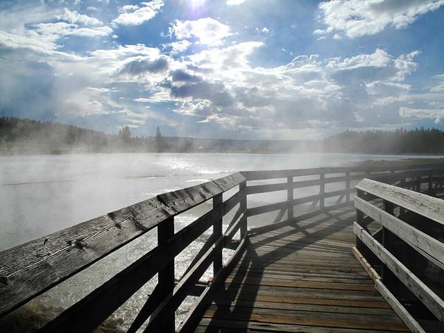 清晨的黄石被罩在雾里,能见度颇低,黄石湖上也漂着白白的水汽犹如仙境。路上的车都开的很慢很规矩,只是会担心突然有动物跳出来。总之,感觉还是很奇妙的,一边是树林,一边近在咫尺却看不到的lake,前方50米外一点都看不见,虽不至于不安全,但有一种开向未知世界的感觉,有点梦幻有点神秘,有小小的紧张也有一丝丝的好奇。