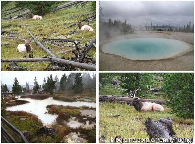 caption:初到黄石还下着雨,云里雾里的看到这些冒热气的小池小池,便是黄石最大的特色,热泉;还有这些有着角的动物elk,是黄石最常见的住户。