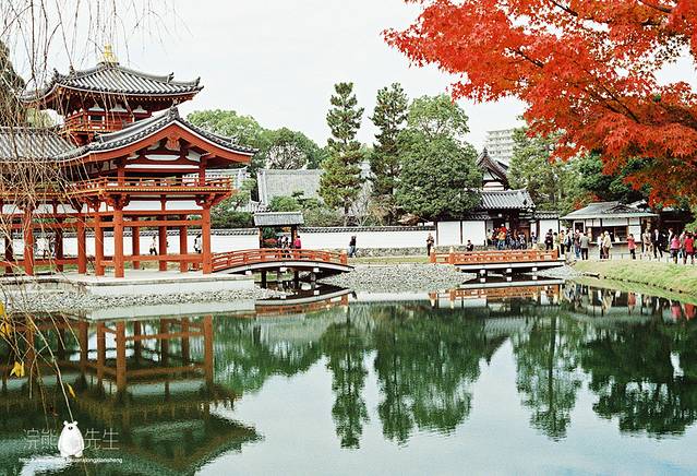 宇治是日本盛产抹茶的地方,貌似不是很大,沿着宇治川一直走到平等院,门口的红叶就已经让我们很兴奋了((٩(//̀Д/́/)۶)),那是真心红啊。