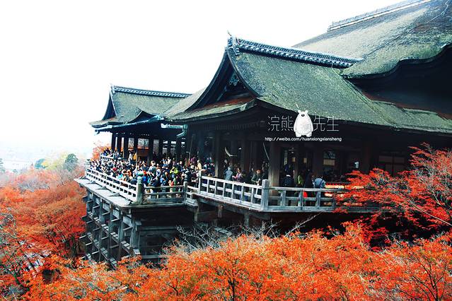 走啊走,看啊看后来就走到了清水寺 清水寺为公元798年(延历17年)由延镇上人所建造,为平安时代之代表建筑物,后来曾多次遭大火所焚毁,现今所见为1633年德川家光依原来建筑手法重建,与金阁寺,二条城并列为京都三大名胜,也是著名的赏枫及赏樱景点。(百度百科) 由于很著名于是人特tm多,感觉都要被挤塌了的感觉啊,而且有不少地方都在修葺,所以拍出来不是很好看,但是枫叶的路真心美哭了~~
