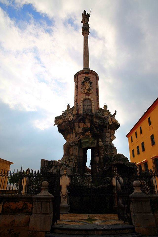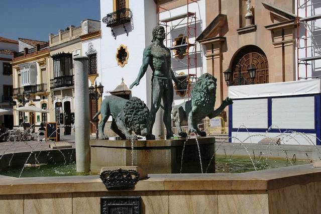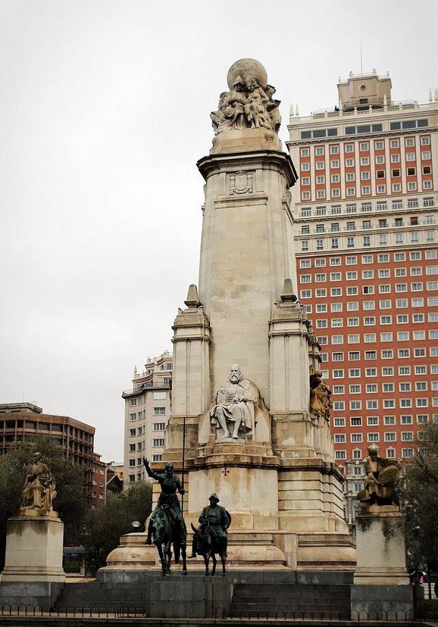 塞万提斯雕像端坐在纪念碑前,俯视着下方手持长矛、骑着瘦马的唐吉柯德和他忠诚的矮胖仆人桑丘的雕像,