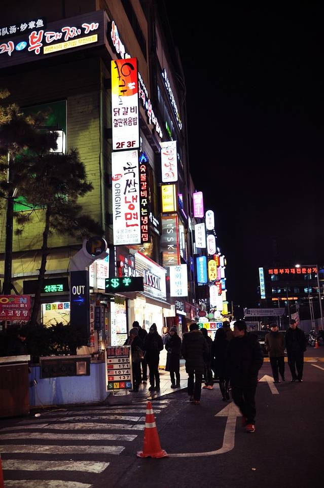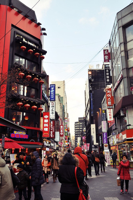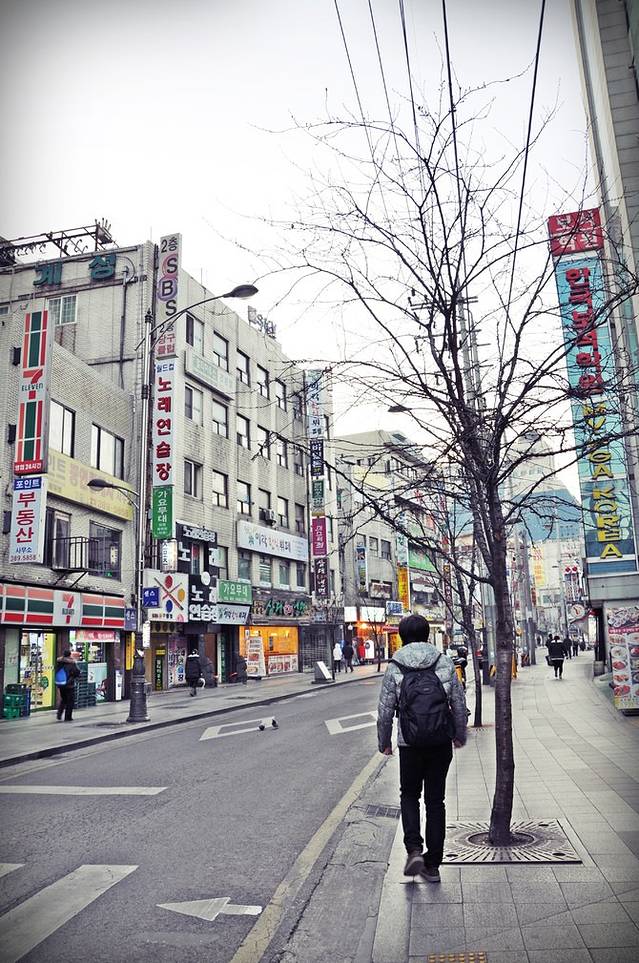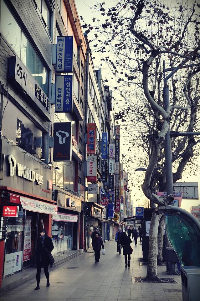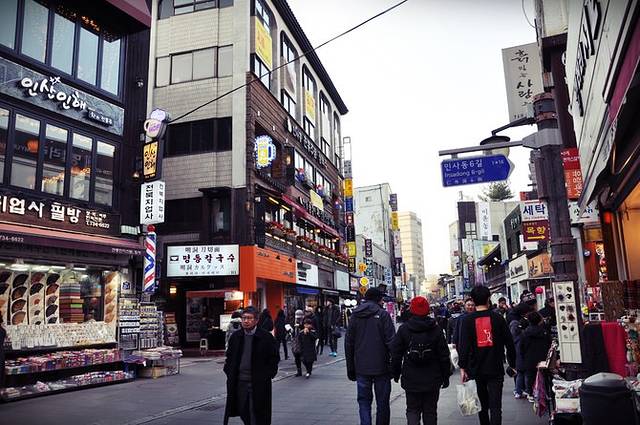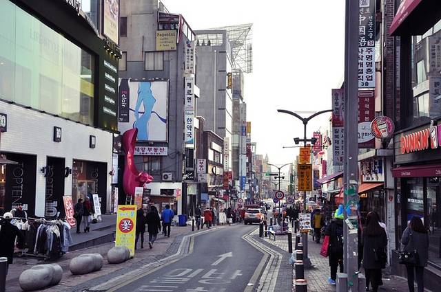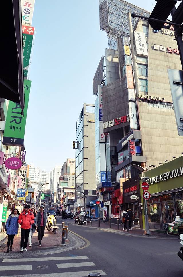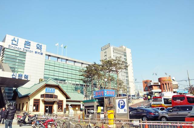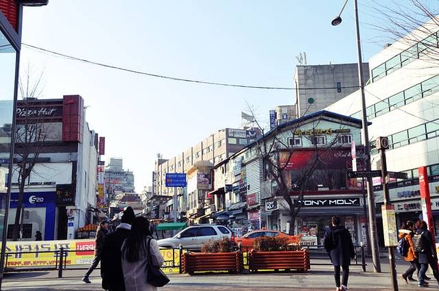 远离弘大地铁站有些萧条,看到远处高楼渐渐多起来,新村地铁站也就不远了。