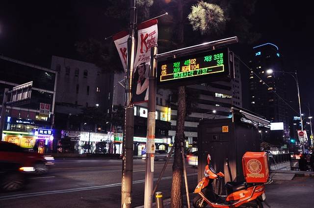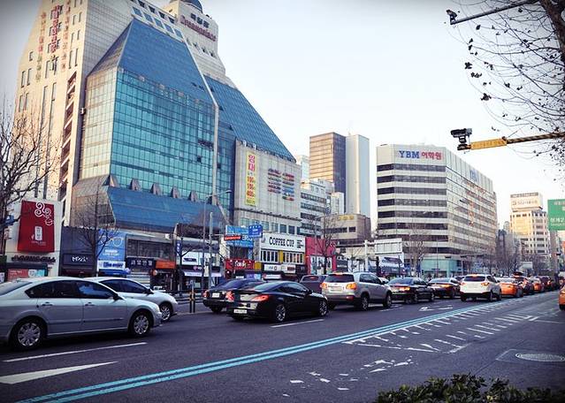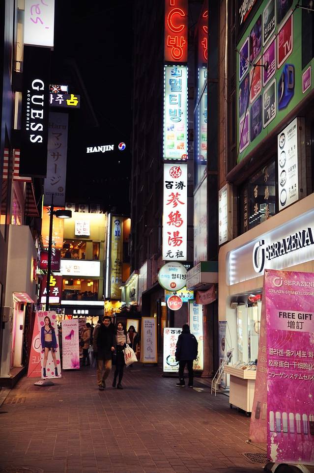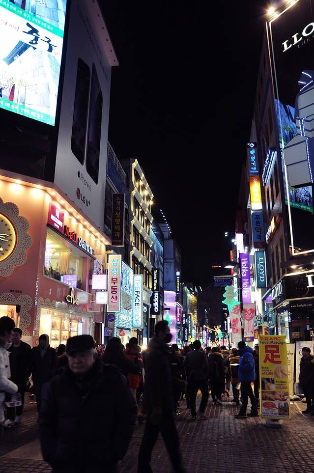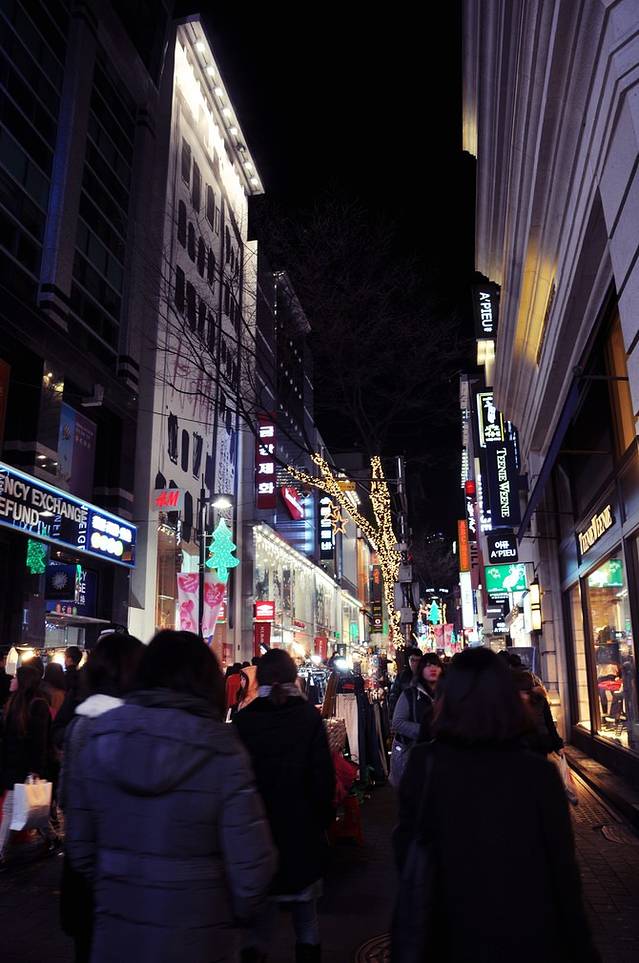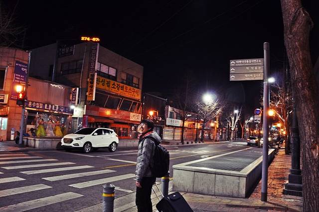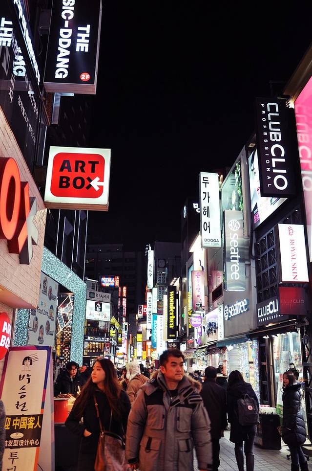 远离弘大地铁站有些萧条,看到远处高楼渐渐多起来,新村地铁站也就不远了。
