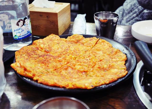 不过得强烈推荐他家的泡菜饼,偶们没有吃过别家的口味,反正他家的太太太好吃了!pizza大小地热腾腾端上来,饼皮是我看的略厚的那种,很酥软,泡菜味道也相当赞,价格10000韩元,不算便宜,不过好吃程度真的举双手推荐!
