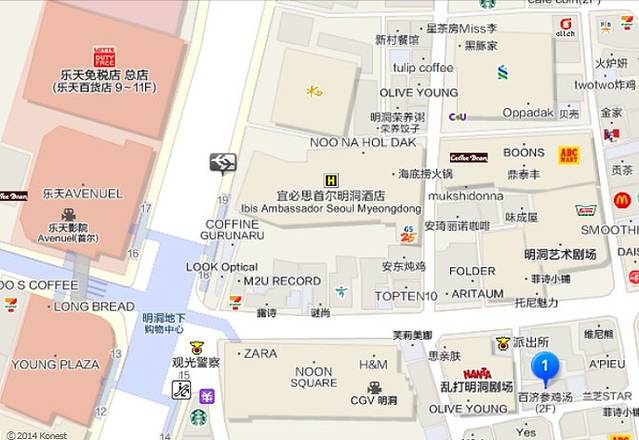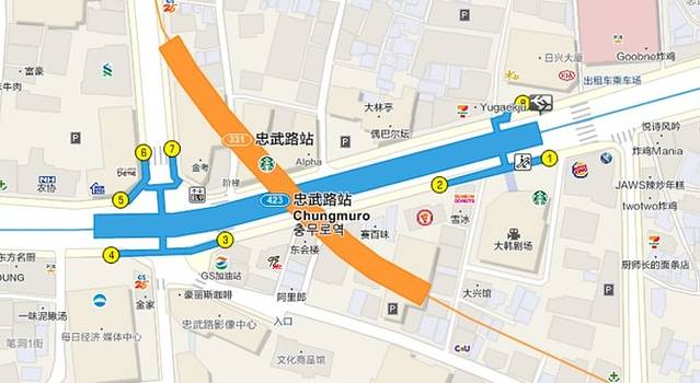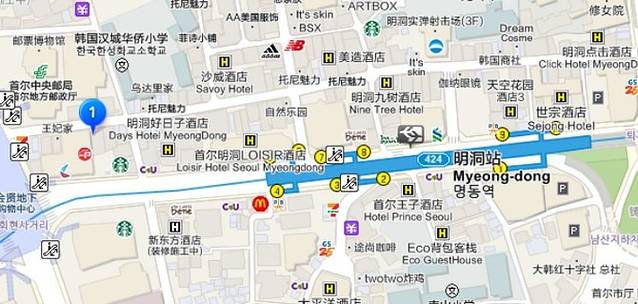 N首尔塔可以坐缆车或者公交到达,我们怕缆车等待时间较长,耽误行程,决定坐公交去。坐地铁到忠武路2号出口出,地图如上。