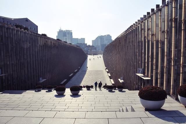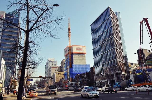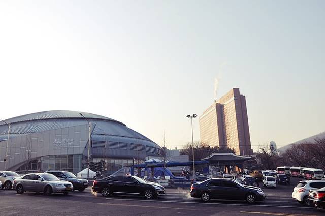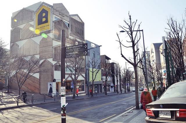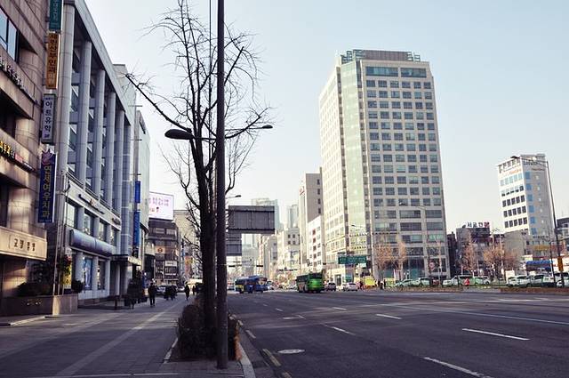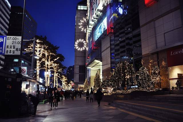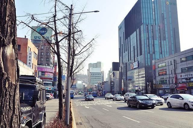 新沙洞是首尔的时尚购物街,长达700多米的路边种上了一排排银杏树,繁盛茂密的枝叶搭成一条天然的走廊,因此也叫做“新沙洞林荫道”。可惜现在是冬季,两边的树木都光秃秃的,能想象秋天银杏飘落的日子这里该是多么美丽!