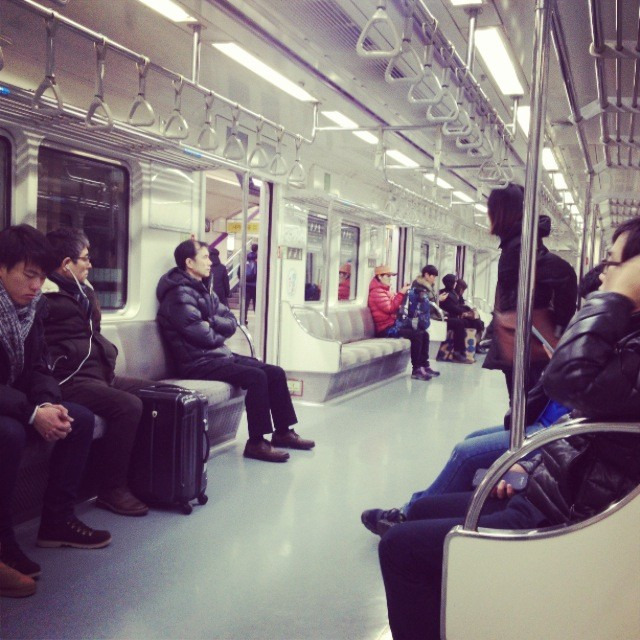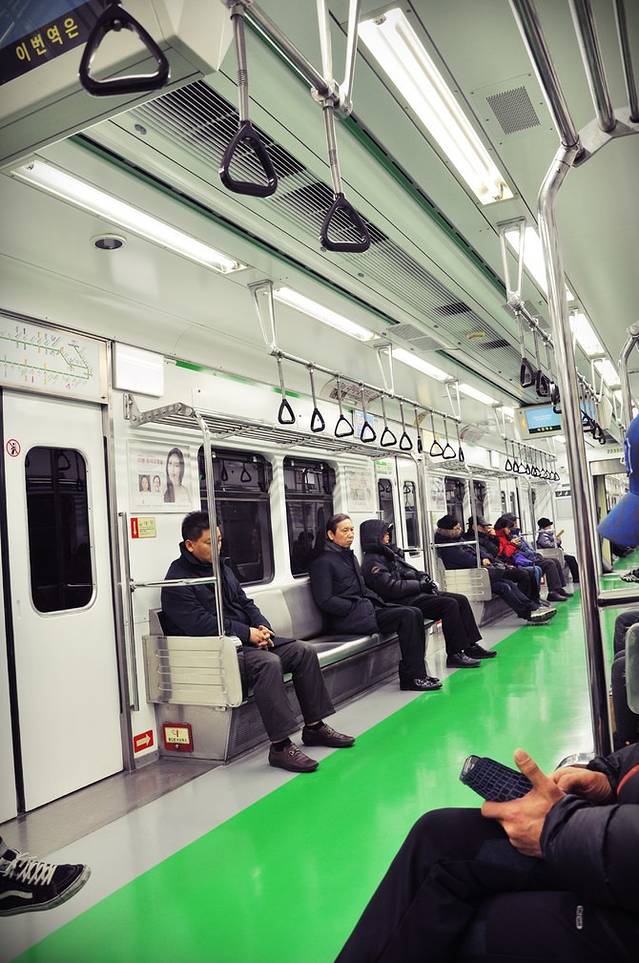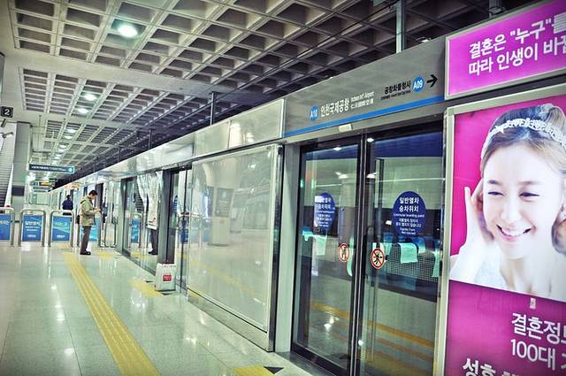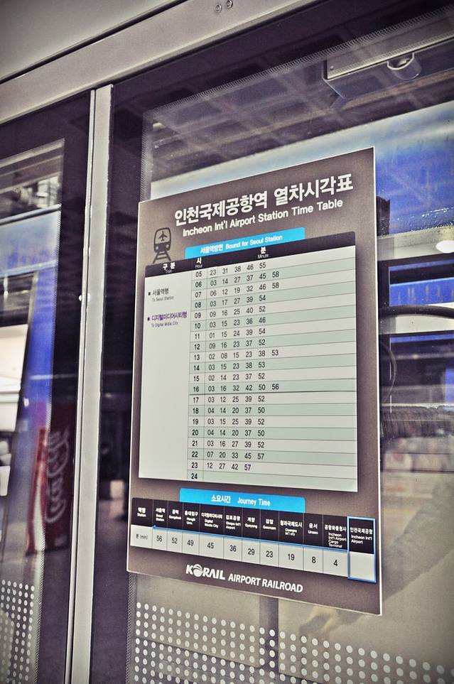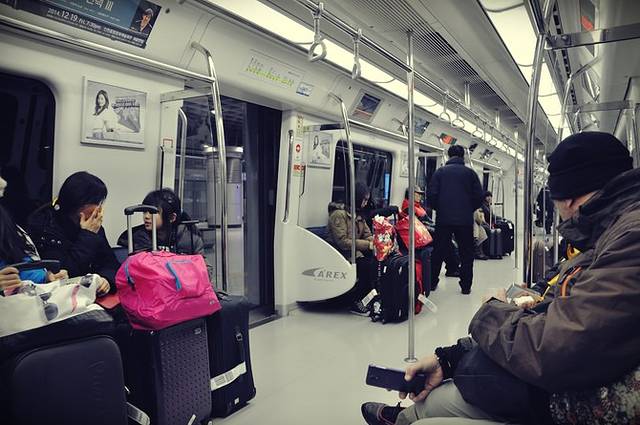 地铁边上便是自动出票机,严格意义上这应该算是机场快轨,共有两条线路直接接驳首尔地铁。一种快车,价格稍贵,座位是火车方式排列;另一种普通车,到市区大概4050韩元一人,座位是地铁的方式排列。偶们买了后一种,因为时间相差不大。