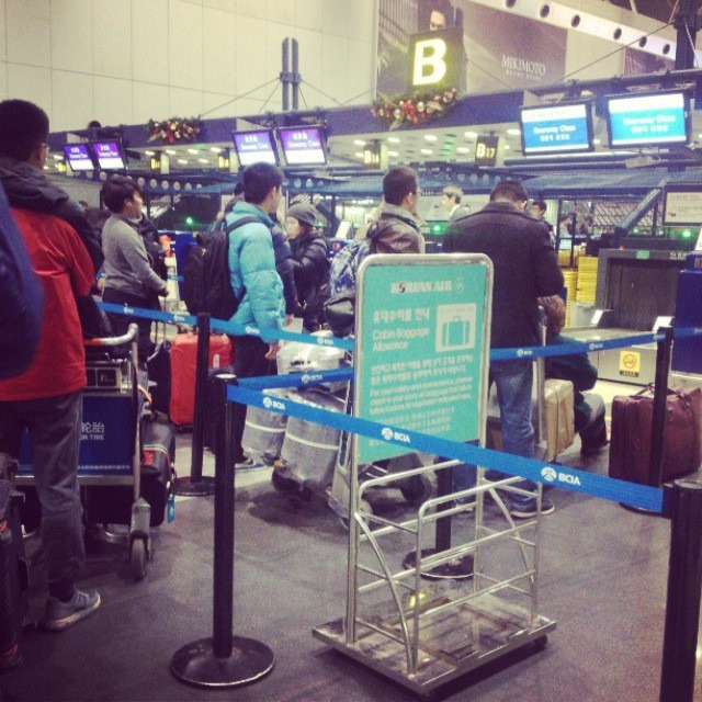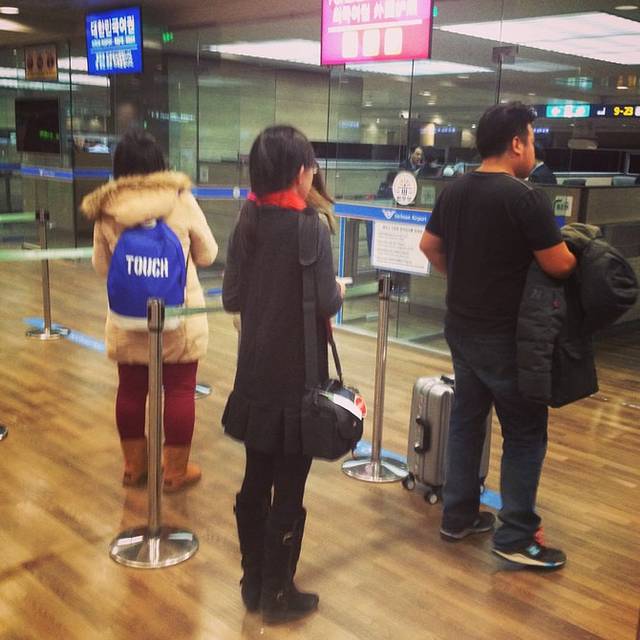 办理登机的时间还蛮久的,差不多排了一小时的队,等安检完到达登机口也就半小时的休息时间了。其实本该休息一下的,毕竟偶们的安排是到达首尔后直接开逛,但偶们实在兴奋地睡不着。