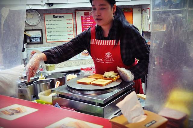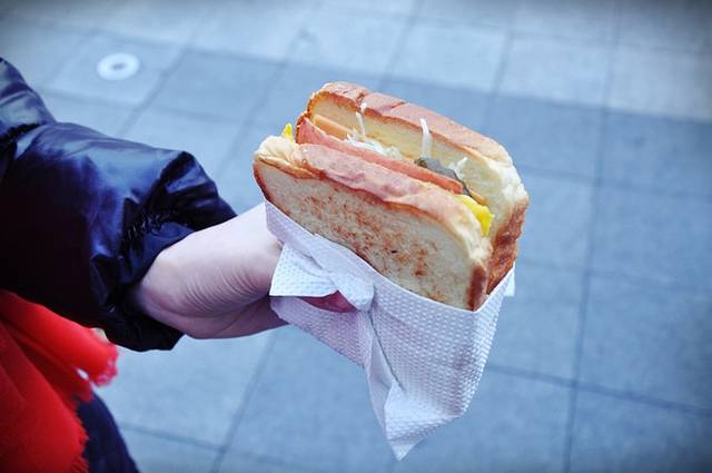 这家土司店是首尔人有名的早餐店,遍布整个首尔。韩国人的早餐真的好单一,一个三明治一杯咖啡就搞定,不像偶们有如此多的选择。这个店是外卖店,可以选择不同的肉和土司搭配,2400-3000韩元不等,分量不大,用纸包着吃。