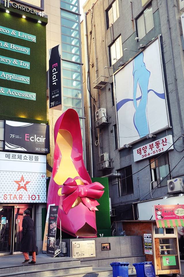 再次穿回梨大正门,出来就是女人街。标志就是这个醒目的高跟鞋。