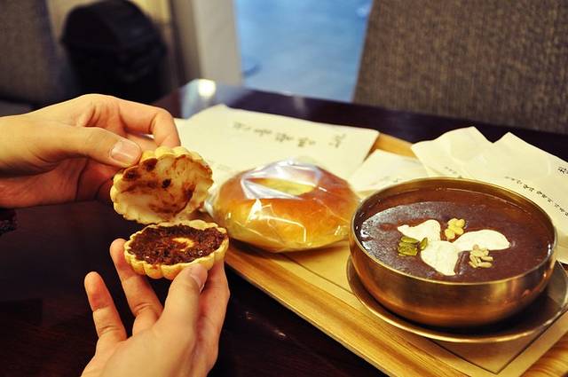点了红豆粥8000韩元,一个红豆面包2500韩元,还有叫不出名字的小甜点6个6000韩元。红豆粥完全是上好的红豆炖煮的,很浓稠的口感,里面有三个糯米丸子,喜欢;