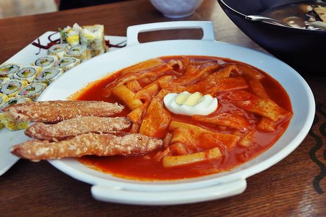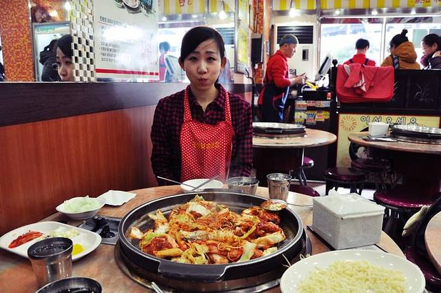 典型的韩式快餐,各种炒年糕、煮年糕、紫菜包饭拼盘、拉面、拌饭,人均70RMB。偶们点了紫菜包饭、乌冬面和辣炒年糕,年糕很辣很过瘾,其他和中国吃到的差不多。
