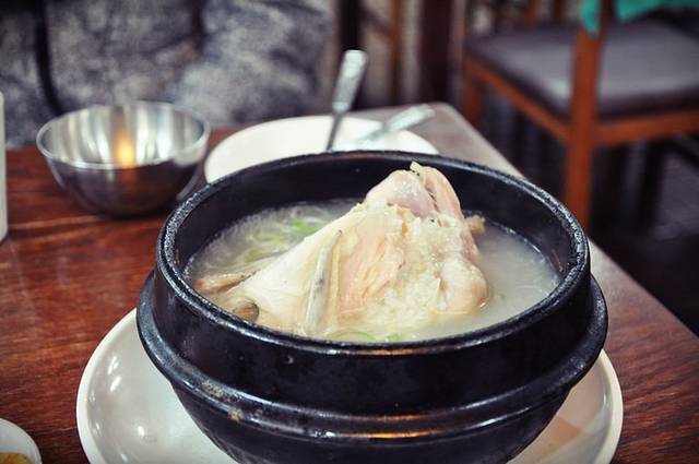 可选的不多,普通参鸡汤(14000韩元),招牌参鸡汤(18000韩元),乌鸡参鸡汤(20000韩元),还有加参的乌鸡参鸡汤(25000韩元)。每种都是一人份的,因为不太饿,单点了一份普通参鸡汤,没要加参的那种,据说就是撒了些所谓参粉,差别不大。热腾腾的鸡汤端上来撒上参酒,口感清甜,伴随淡淡的参味,很好喝。鸡是小小的一整只,很新鲜很软烂,里面塞了满满的糯米,想不到糯米煲汤湿湿糯糯如此美味,以后在加煲汤也可以尝试。