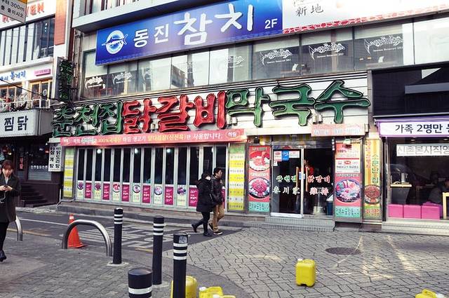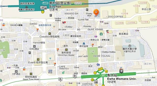 新村是韩国延世大学、梨花女大、弘益大学、西江大学聚集的大学街区。作为韩国大学街代表的新村,布满了氛围讲究的餐馆、酒吧、网吧、卡拉OK、漫画房等娱乐文化空间。而梨大则有许多女生们喜欢的服饰店、美发美容店等。偶们的计划是坐地铁到弘大站附近转转,然后步行至新村站,在附近的春川家辣炒鸡排解决午餐,饭后再步行至梨大,游览梨大和女人街。
