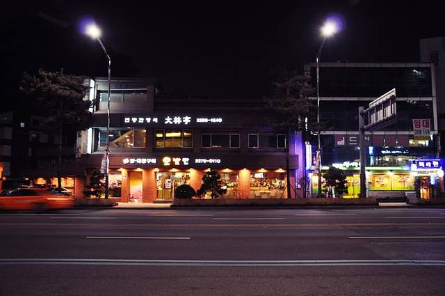 此时天已经黑了,我们等待的地方就在大韩剧场前,对面是大林亭