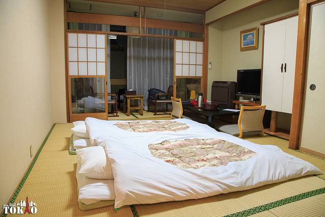回到房间,服务员已经帮我们铺好了床褥。今天住的是日式房。洗脸在阳台,卫生间和浴室在门口,这个设计有点奇怪,不过都去泡温泉了,卫生间倒是都没用过。