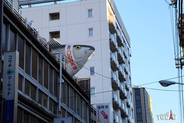 一群人正围着看一家店铺宰杀巨型金枪鱼。没看到鱼市场交易,看到杀鱼也是赚到了,哈哈~~