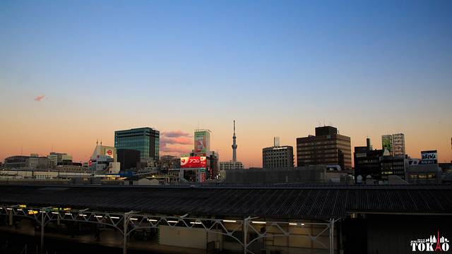 霞光将天空映照成了从蓝色到橘色的渐变。远处的天空树分外的显眼。
