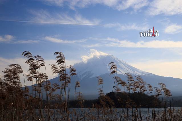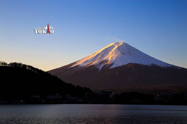 随着夕阳下沉,富士山顶的云层逐渐散去,露出雪白的山顶。