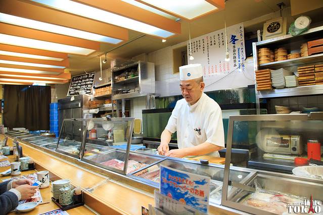 已经有很多妹妹坐着在吃了。寿司师傅正在快速又优雅地捏着寿司。