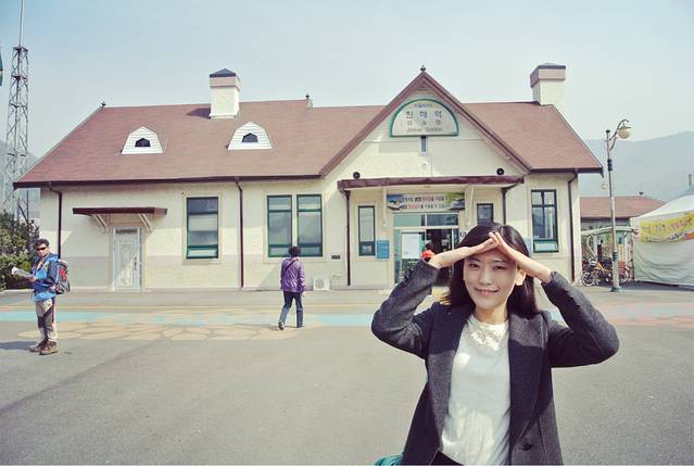 【第二站庆和站】早就在各种地方看到了庆和站的图片,这条火车道浪漫极致哇。从镇海站对面的公交车站坐307路巴士,大概经过8站就到了庆和站,虽然不是周末,还是有好多人来到此处,天气也非常暖和,韩国MM们都光腿穿裙子了。