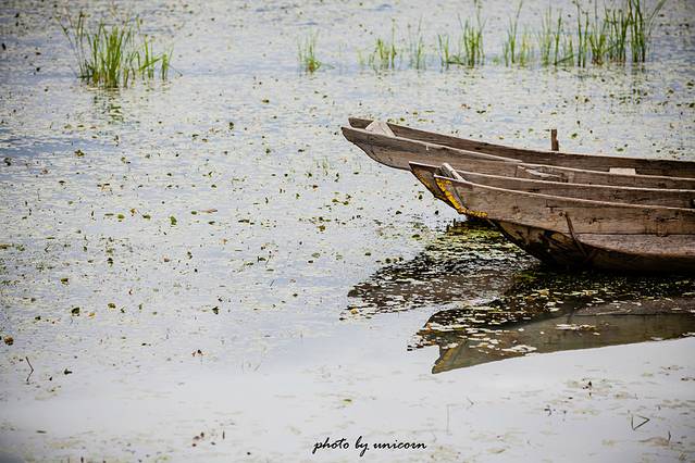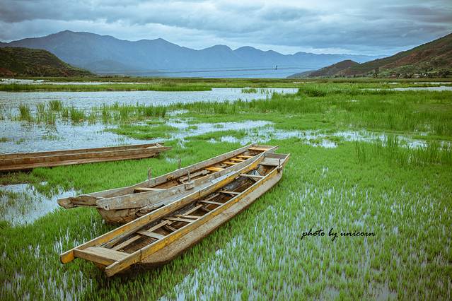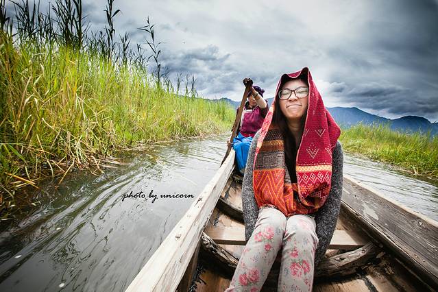 第二天一早我们先去洛洼半岛的码头租了一个小时的游船(70元),也当地摩梭人自己家的改型的猪槽船开始游湖看草海了~~
