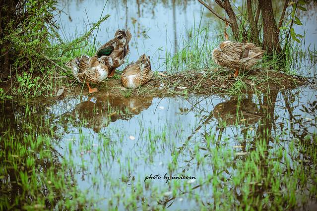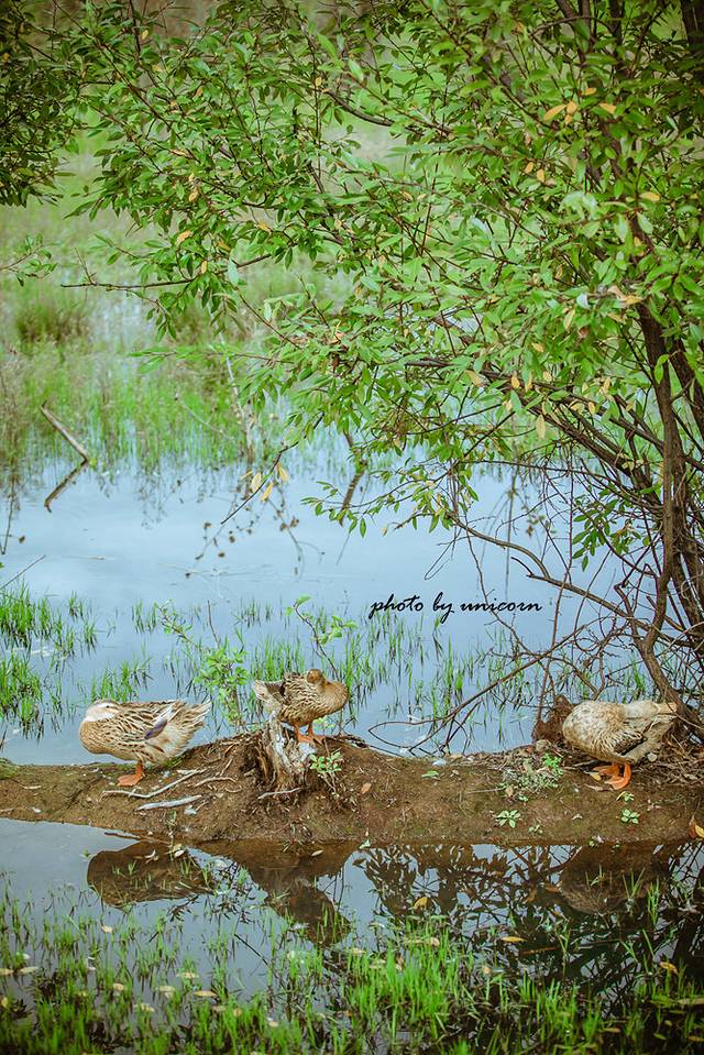 桥边,树从中, 鸭子鸳鸯全扎堆休息~~
