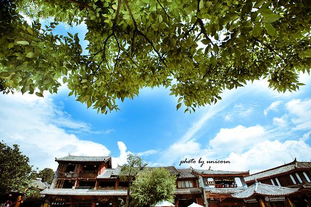 古城内的四方街仰拍,喜欢蓝天和绿叶~~
