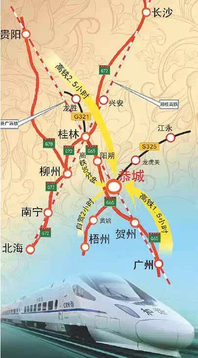 桂林市恭城镇乐湾村距离恭城汽车总站仅4公里。距离贵广高铁恭城站11公里,南北方向可以从湘桂高铁进入桂林再转贵广线,桂林到恭城的高铁目前是一天12趟,恭城到广州一天10趟。