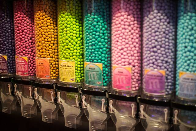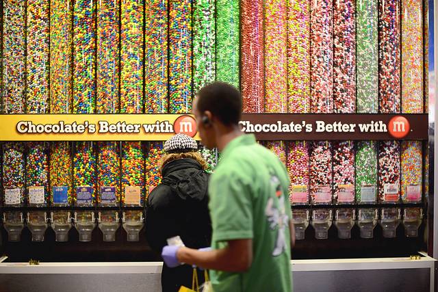 走到MM豆的店,终于见到了小时候梦里的情景-----和水龙头一样打开哗哗哗的吃巧克力啊!!!