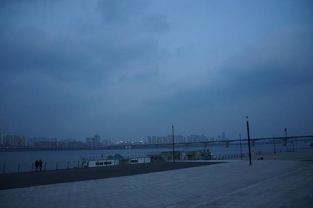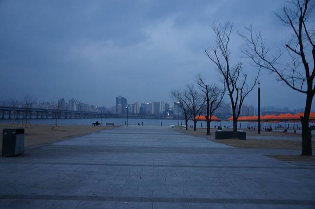 汉江边盘浦大桥:地铁九号线高速巴士客运站B-2出口,左转,往住宅区方向一直直走,走过一个网球场,穿过一个桥洞,到自行车租赁的地方,在发光变色的地方即是月光广场,夏季时大桥有月光彩虹喷泉,听说景色非常美